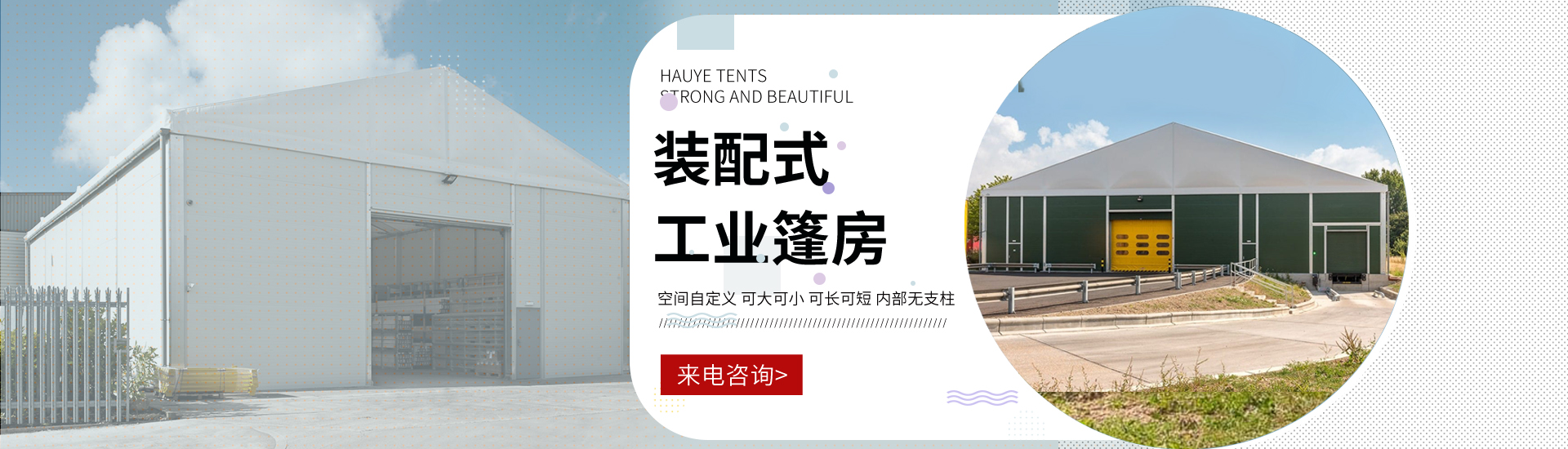 可租可售,合理應用資金;3天5000平米,不懼各種爆倉;倉庫篷房,輕松應對各種存儲問題;抗風抗雪防雨、阻隔紫外線,沒有地點限制,有空地即可,定制適合您的倉庫。
